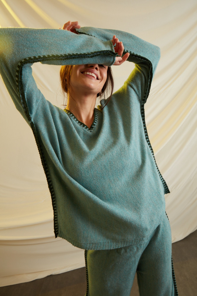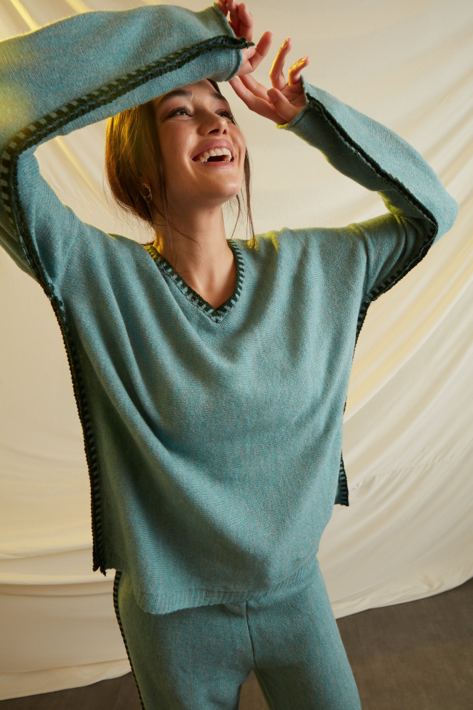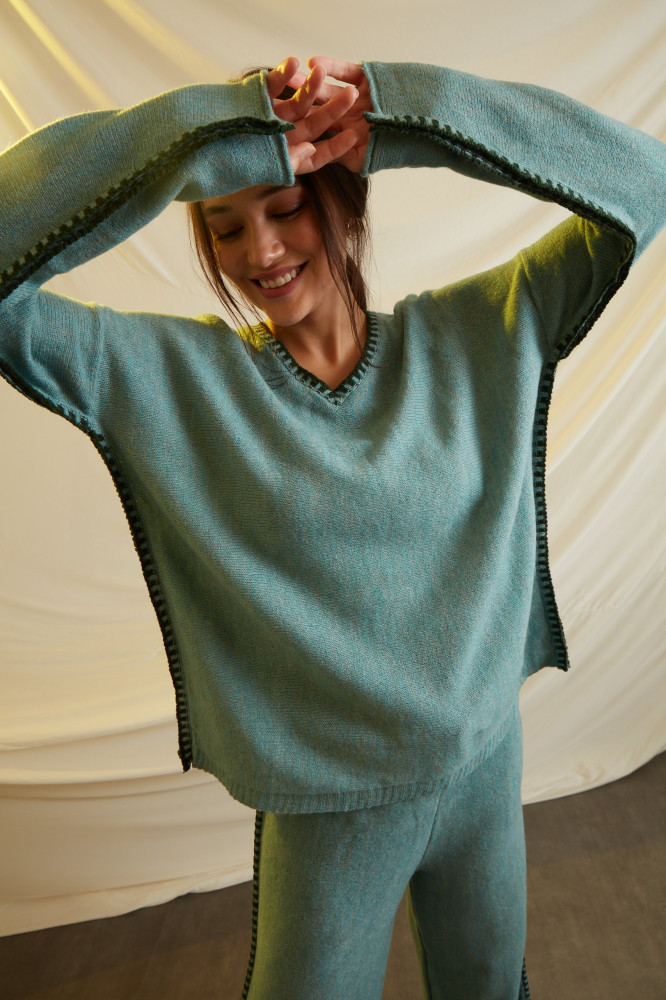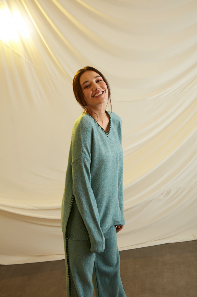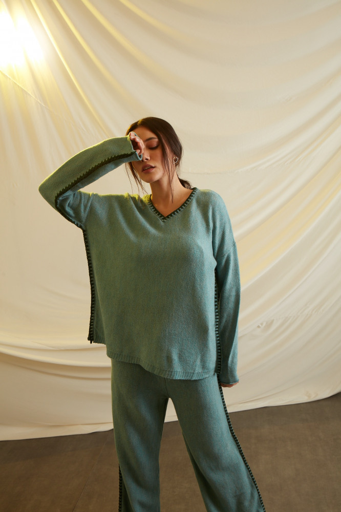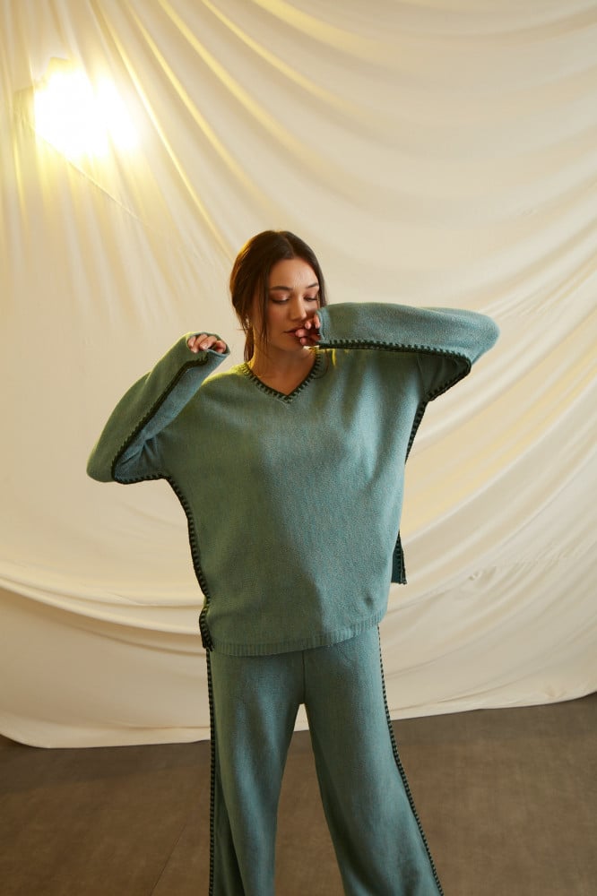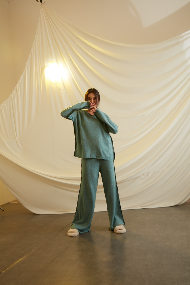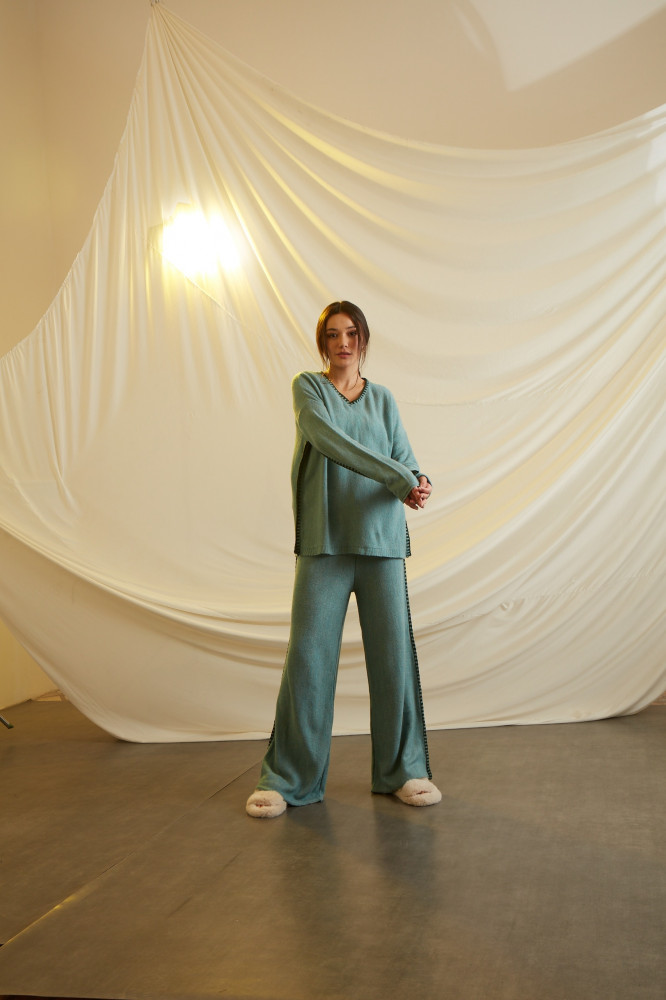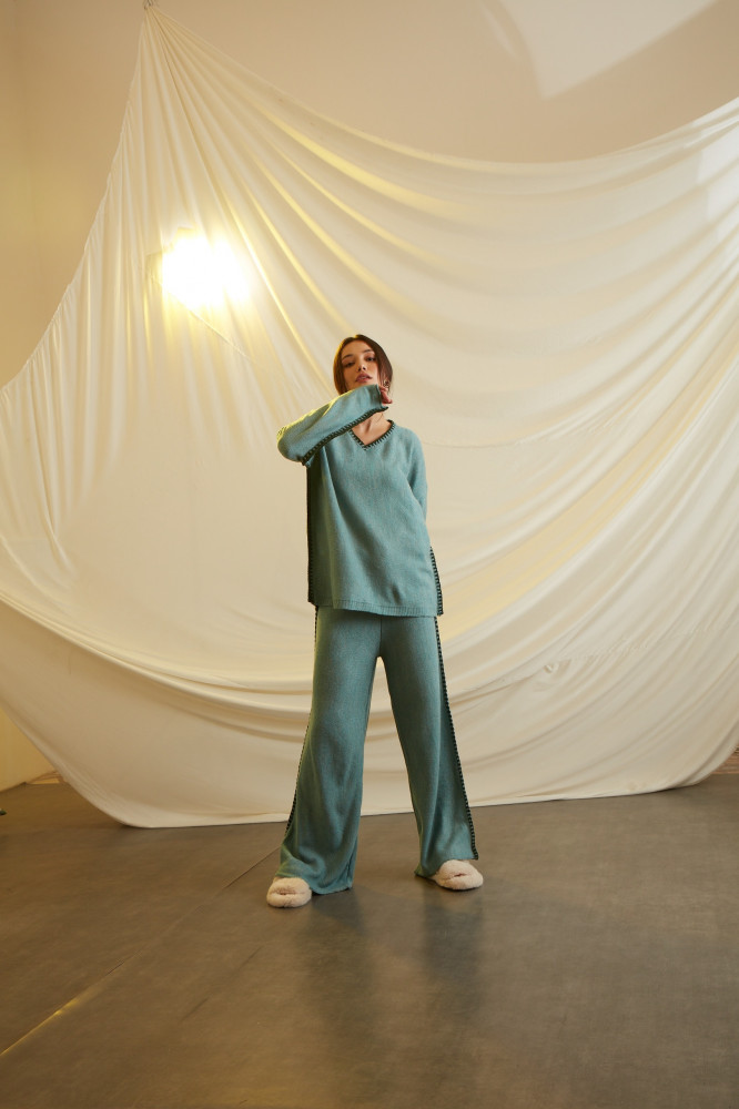 A COMFY SET WITH LOOSE AND COZY FEEL WHEN WORN WITH EMBRIODERY ON THE SIDES.