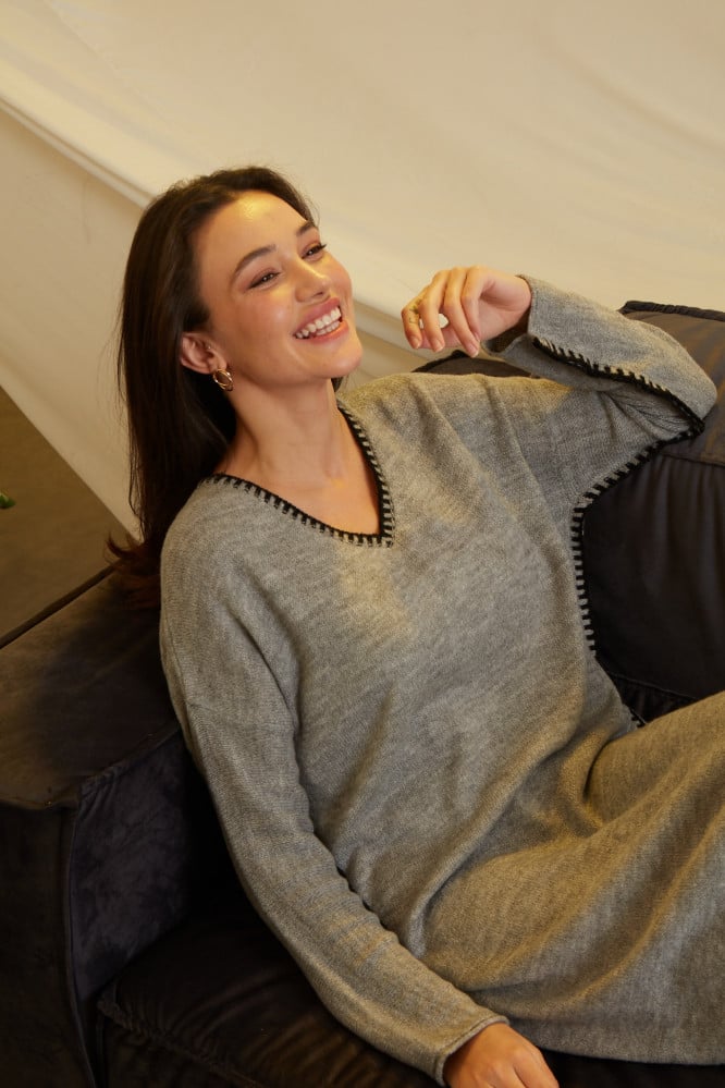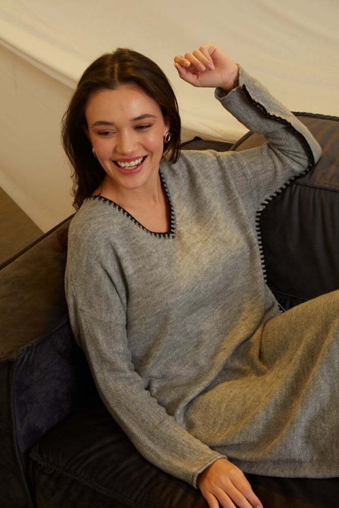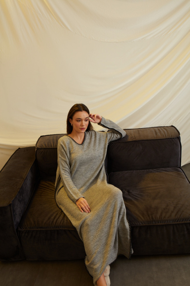 A COMFY DRESS WITH LOOSE AND COZY FEEL WHEN WORN WITH EMBRIODERY ON THE SIDES.
